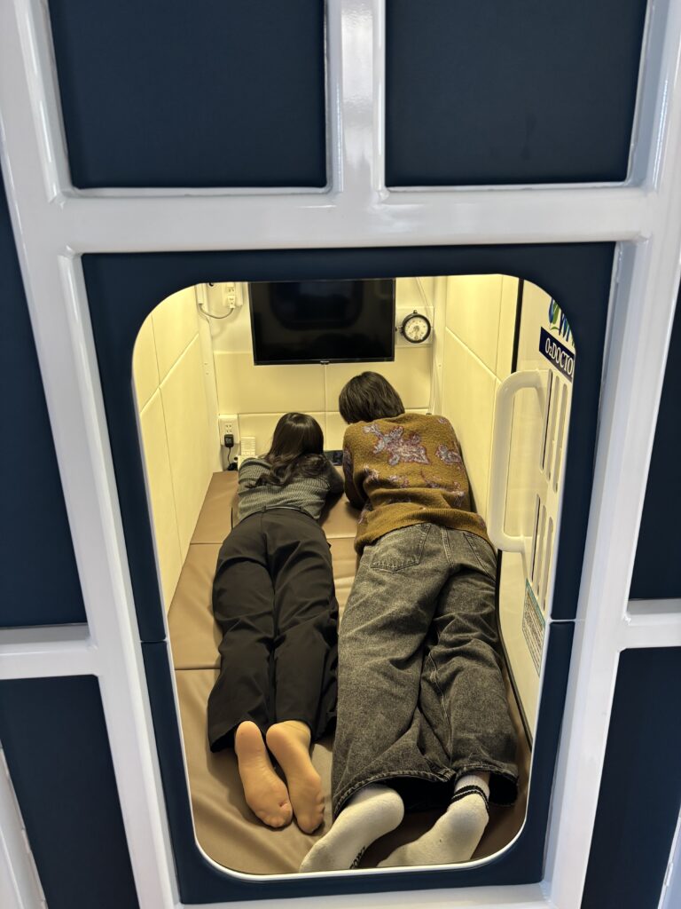 酸素ボックスでは、気圧が少しずつ高まるため、飛行機に乗った時のように耳が「キーン」とすることがあります。